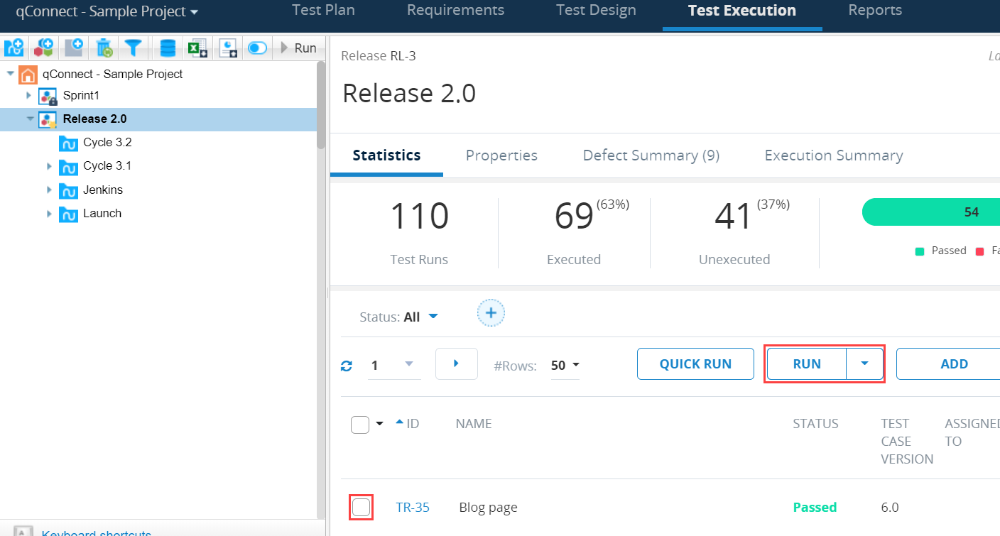 When executing Test Runs from the Grid view of the Test Suite, a tester can directly access the TestPad by adding a check mark next to the desired Test Runs and clicking the Run button.'
