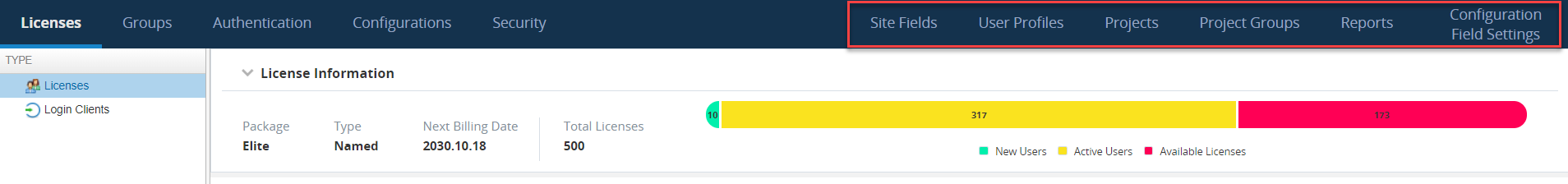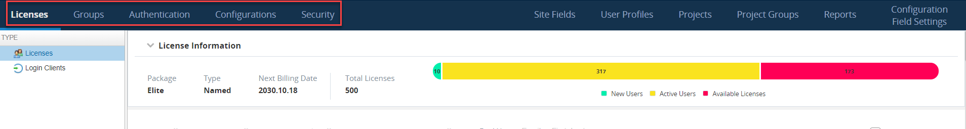 Licenses: Invite and manage user information such as passwords and activation status.