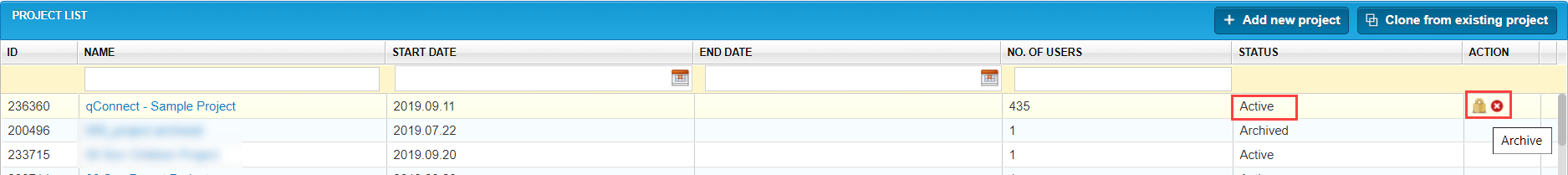 Locate the Project that you want to archive, and select the Archive icon from the Action column.