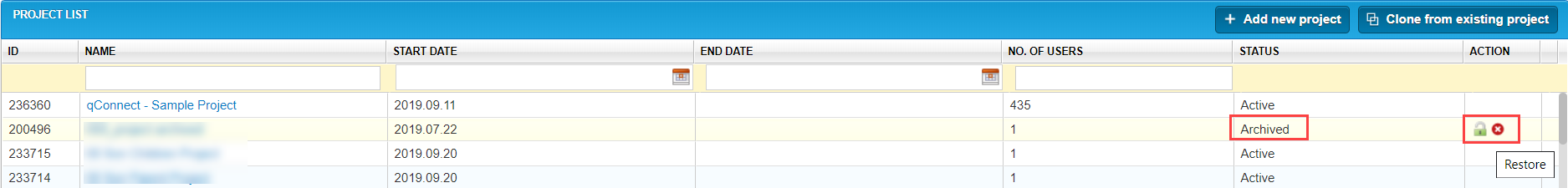 Locate the Project that you want to archive, and select the Restore icon in the Action column.