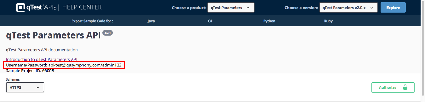 You can use sample credentials listed in the API documentation page to log in to qTest Manager: