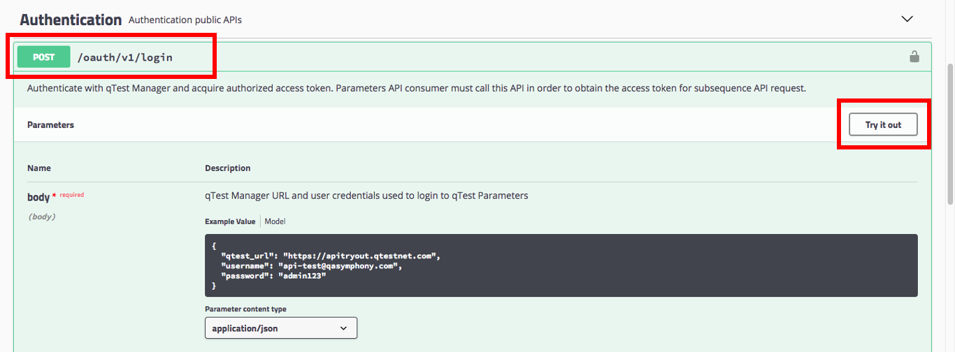 API endpoint: https://parameters.qTestnet.com/oauth/v1/login