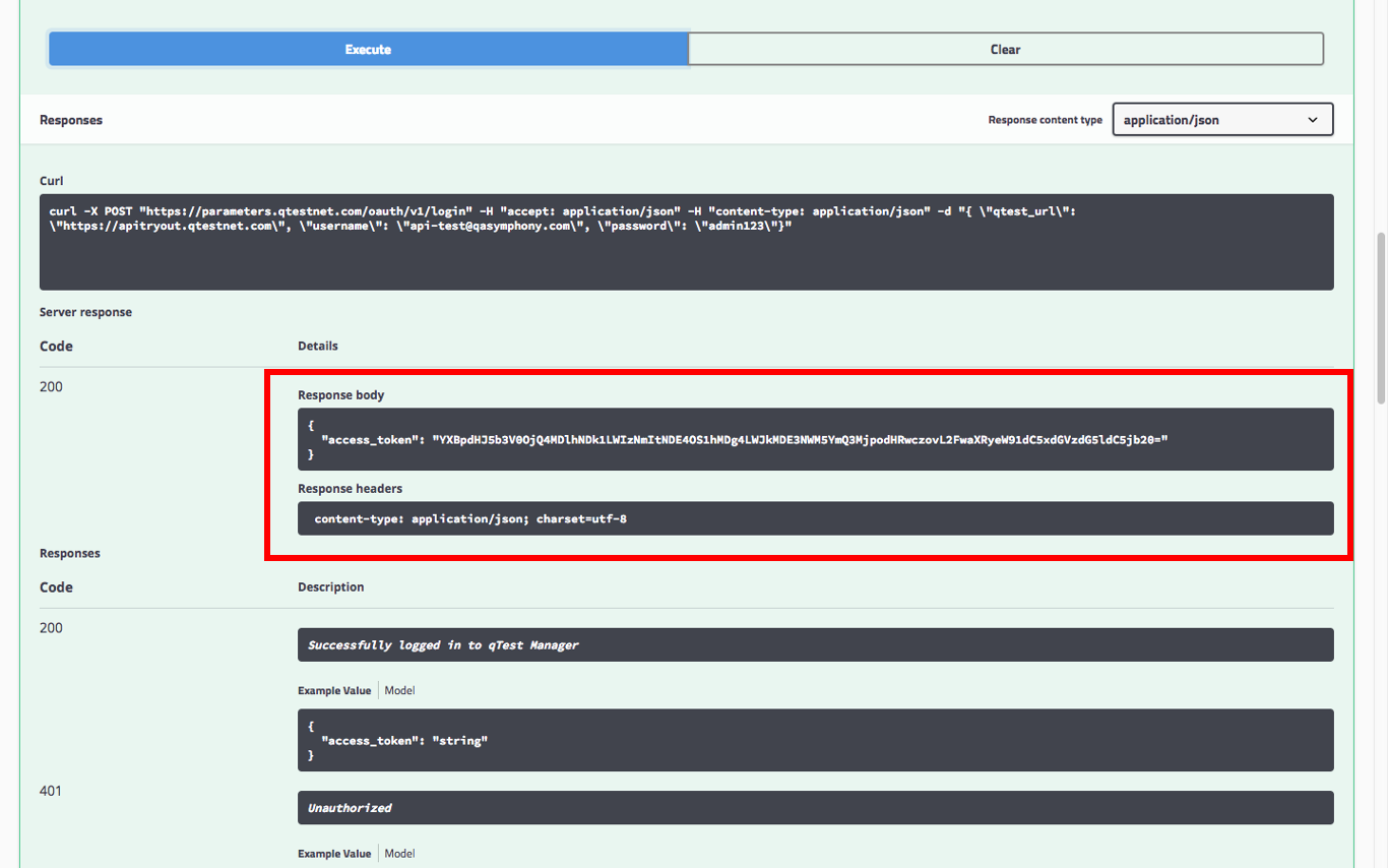200: This response code indicates that you have successfully logged in to qTest Manager and has permission to access to qTest Parameters. You can obtain the access token in the response payload.