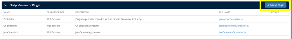 To submit custom plug-in, click on + Submit Plug-in button in the top right corner of Script Generator Plug-in section.