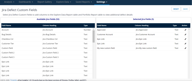 Use these settings to determine which Jira fields you want to include in the Explore Data > Defects (External) report and the Portfolio Report.