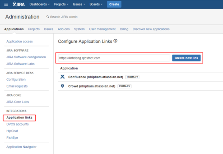 To create a new application link, enter your qTest Manager instance’s URL in the text field and select the Create new link button.