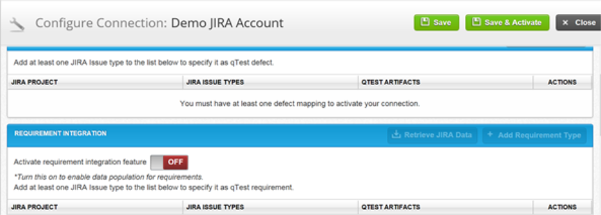 The Configure Connection page displays. From this screen, you can both configure Defect integration with Jira and import Requirements from Jira.