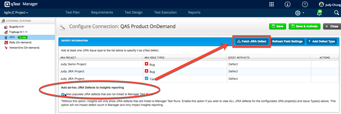 If you have enabled Unlinked Jira Defects to bring in Jira Defects into Insights for reporting, then you will need to re-sync Jira Defect data. You can see if your qTest project has this enabled by looking for the check box selection in the Add ad-hoc Jira Defects to Insights Reporting section toward the bottom of the Defect Integration section.
