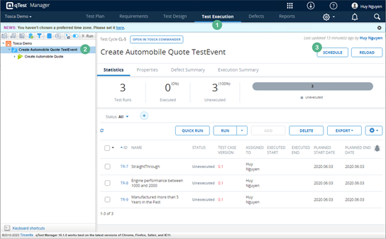 Step 3: Schedule Test Execution for the Test Cycle, which is linked to a Tosca TestEvent, in qTest