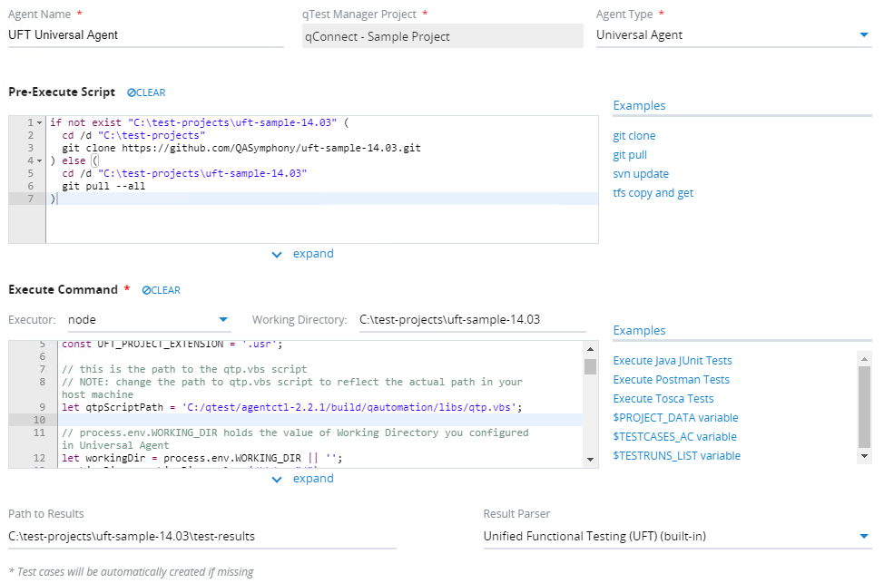 If you want the Universal Agent to submit test results to qTest Manager, you must specify values for both Path to Results and Result Parser. Otherwise, you must do that yourself through Execute Command.
