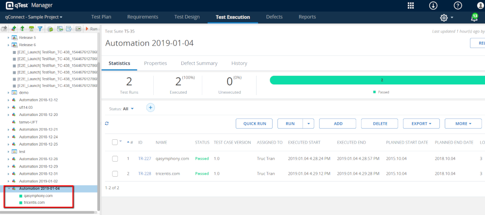 From qTest Manager, select the project qConnect Sample Project, and then click the Test Execution tab. Do the following: