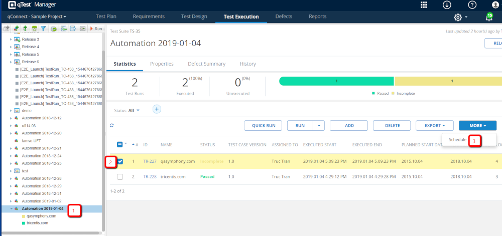 Select the newly created test suite,. In our example, it is Automation 2019-01-04.