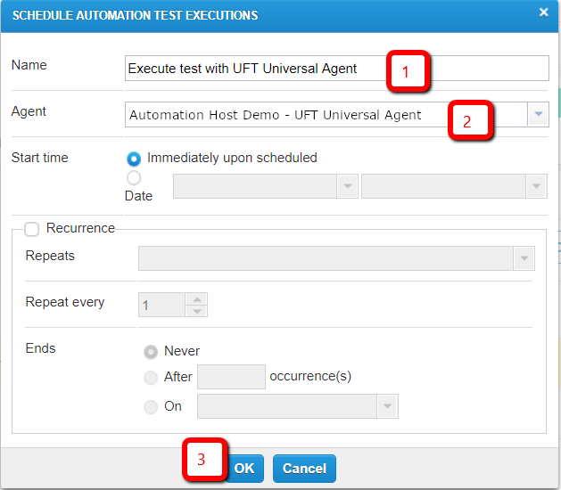 Name: Name of the schedule, such as Execute test with UFT Universal Agent