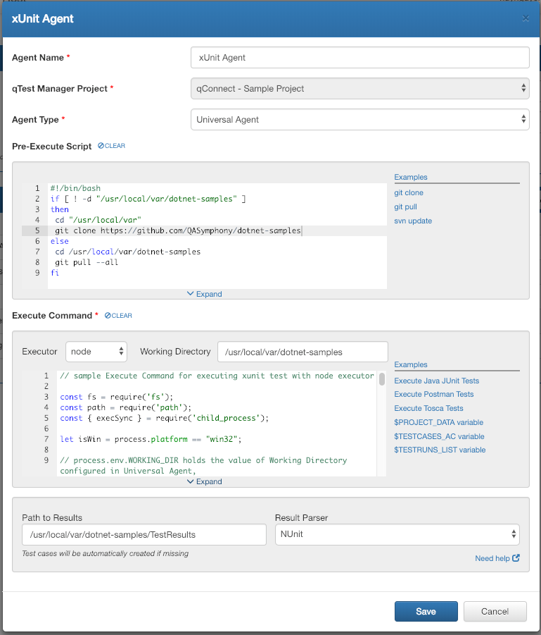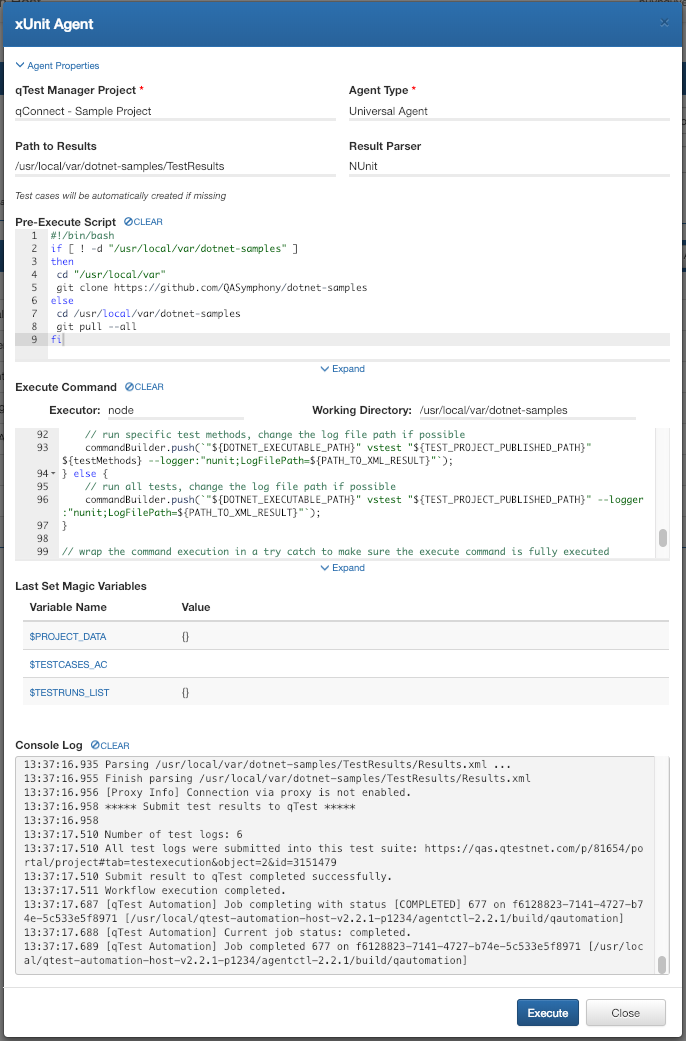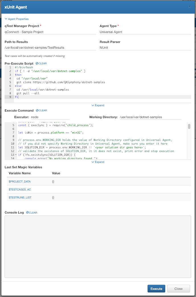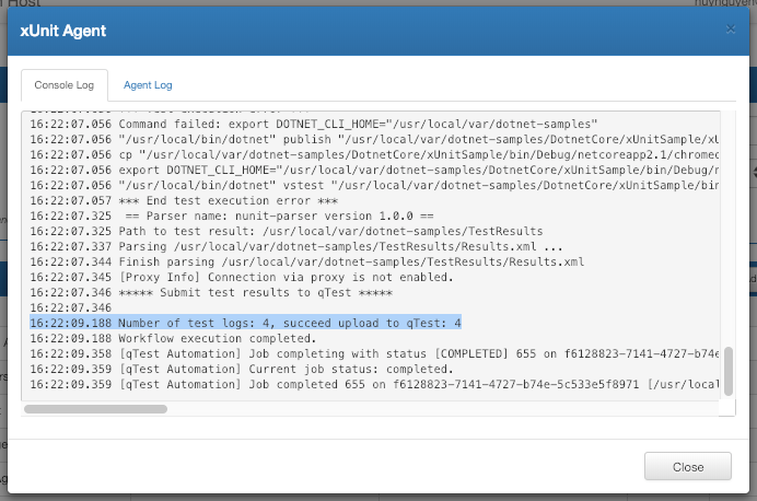 If the value of TESTCASES_AC variable is empty, which means there is no test runs being scheduled to be executed (such as when this Universal Agent is executed in the first time), we will let the agent execute the whole tests in our xUnitSample project then create test run logs to qTest Manager as the execution result.