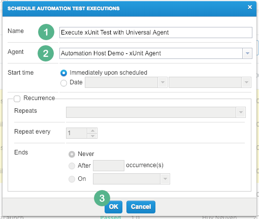 Click the OK button to complete Test Execution scheduling for the selected three test runs