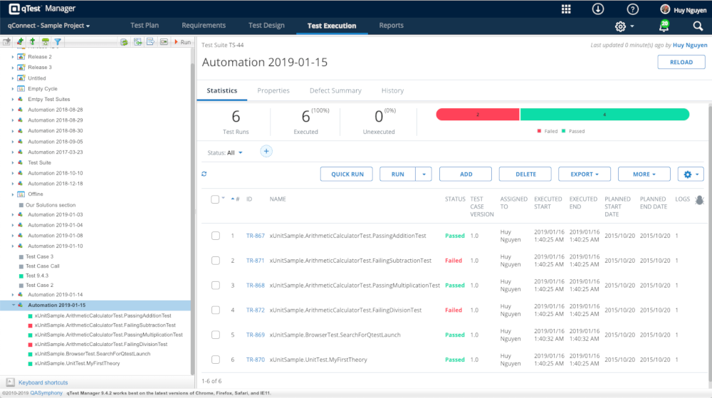 Next, access qTest Manager. Select qConnect Sample Project then go to the Test Execution module. You'll see the test results submitted to qTest Manager as Test Runs under a Test Suite named Automation YYYY-MM-DD, where YYYY-MM-DD is the date the agent is executed, as below.
