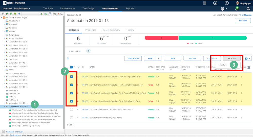 From qTest Manager, select the project qConnect Sample Project, then click the Test Execution tab and do the following: