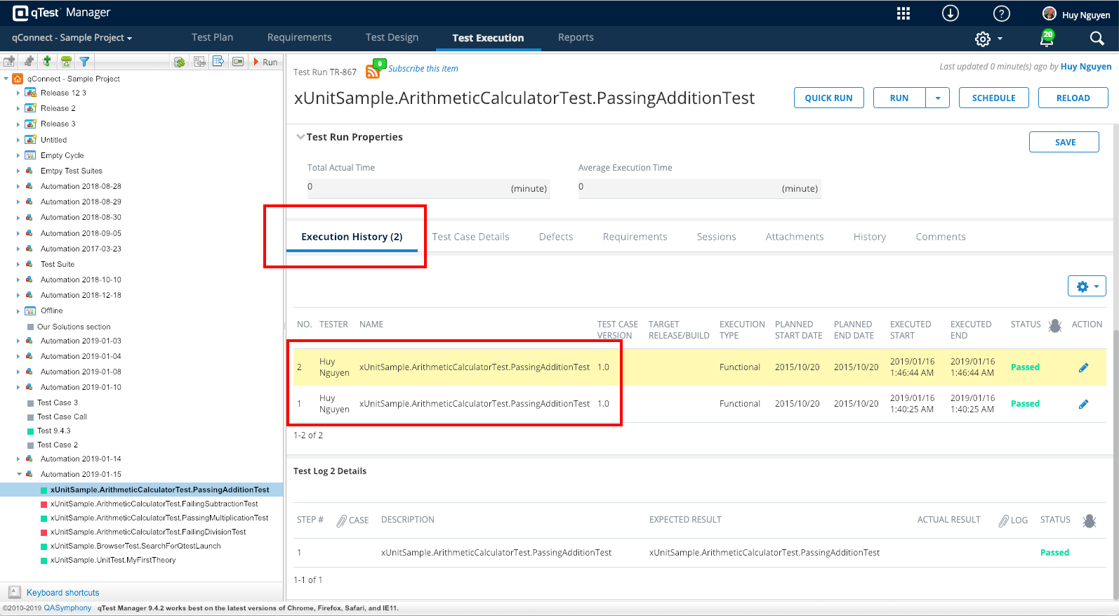 Now get back to Test Execution module of qConnect Sample Project project in qTest Manager. Click on each test run that was scheduled to be executed, you'll see the Execution History of each test run was updated with two test run logs: one test log created when the agent was first executed, and one test log from the scheduled execution.