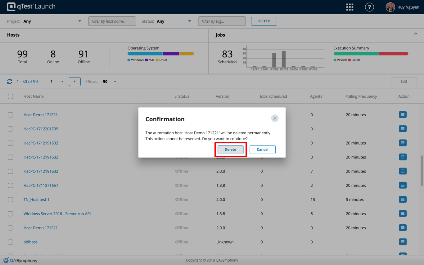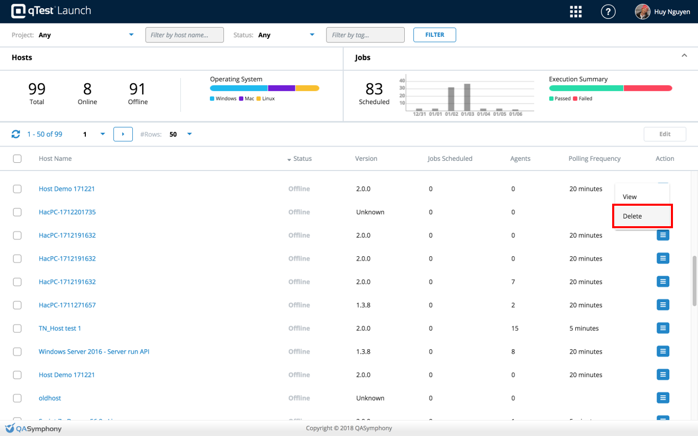 You can delete any host machine, provided that it is offline. The host status is updated as Offline if it does not poll to qTest Launch after 30 minutes.