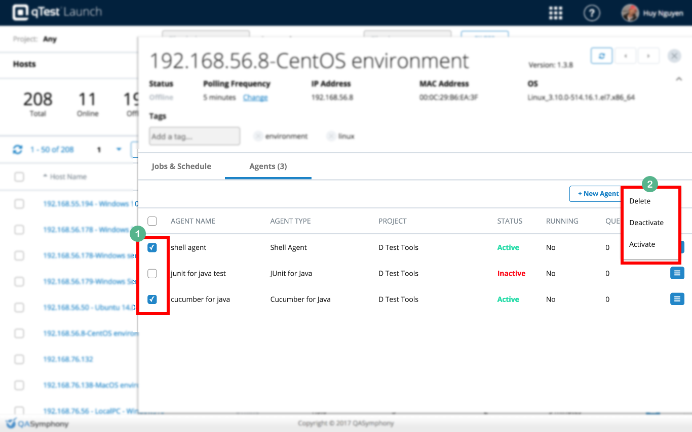 To view and manage agents from the host, click on the Agents tab. All the agents running in the host are shown in the agent list.