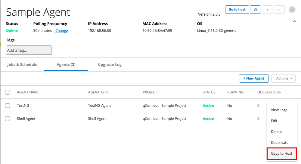 To copy multiple agents from one host instance to another, select the agents you want to copy to, then click the Actions button and select Copy to Host.