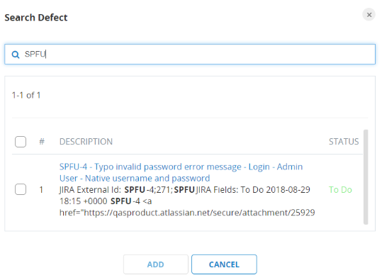 When executing a test, you may find a defect that was previously reported and already exists in Jira. In this case, it is useful to link to the existing defect in Jira. rather than create a duplicate defect. To link to an existing defect in Jira, perform the following steps: