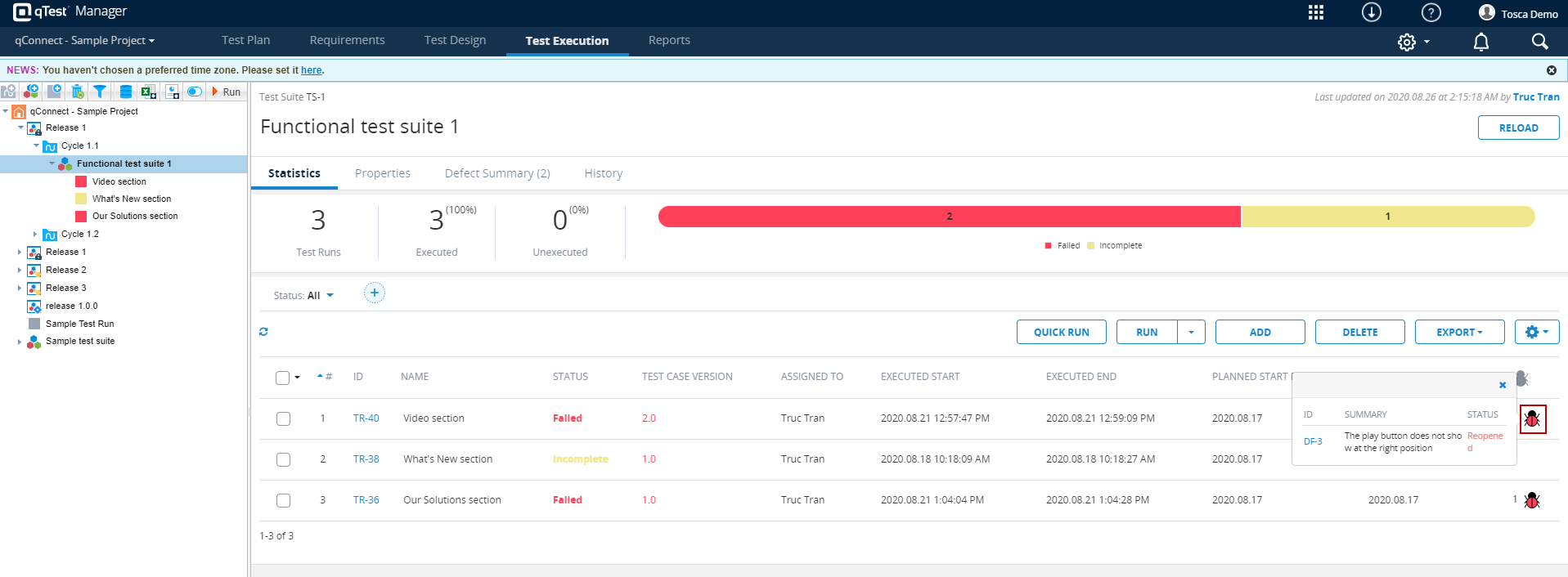 Before you submit a defect from qTest Manager to Jira, make sure you have correctly set up your integration and installed the browser plug-in from the resource center.