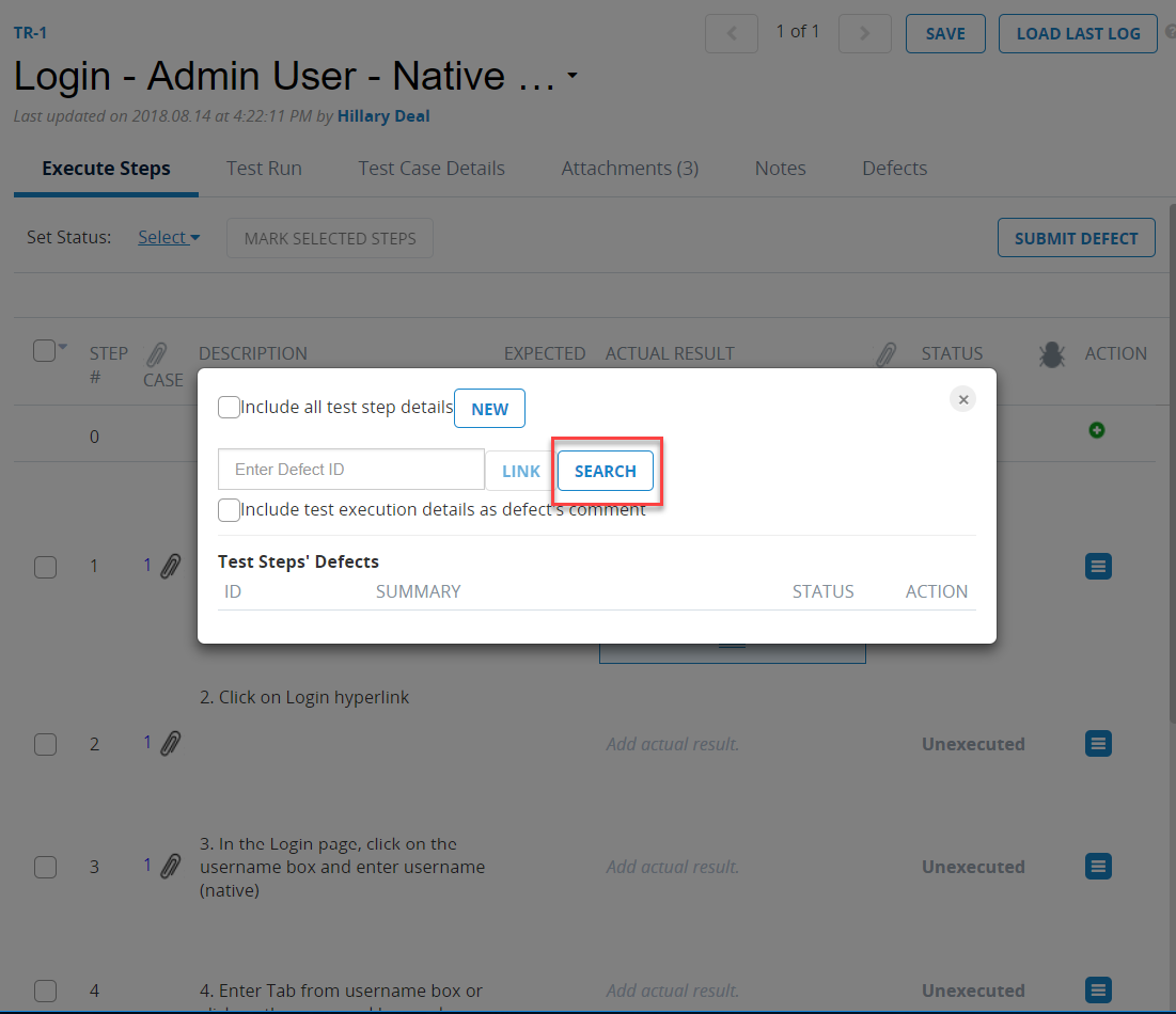 If you want to link the Test Log/Test Step to an existing defect, enter the Defect ID (if known) and select Link.