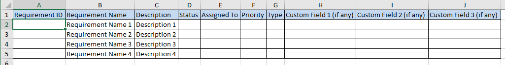 In Microsoft Excel, fill out the sample import template by entering the IDs, names, text, statuses, priorities, and types for each Requirement.