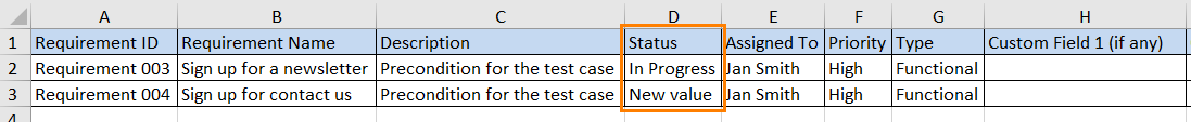 Continuing the example, suppose your Excel spreadsheet contains two Requirements. In Requirement 003, the value In Progress for the Status field matches an existing value for this field in qTest Manager. However, in Requirement 004, the value New value for the Status field does not match an existing value for this field in qTest Manager. This value should be updated to match an available value for the Status field in qTest Manager.