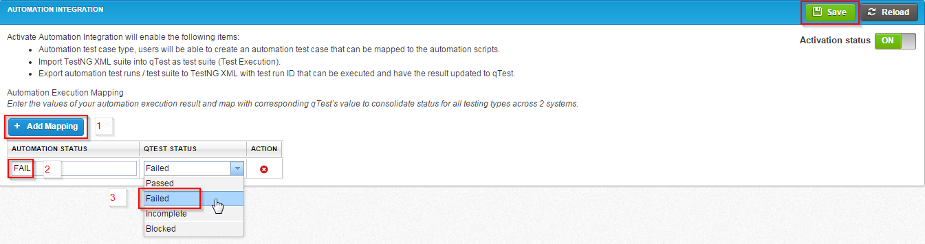 In the Automation Integration section, switch on the Activation Status using the toggle.