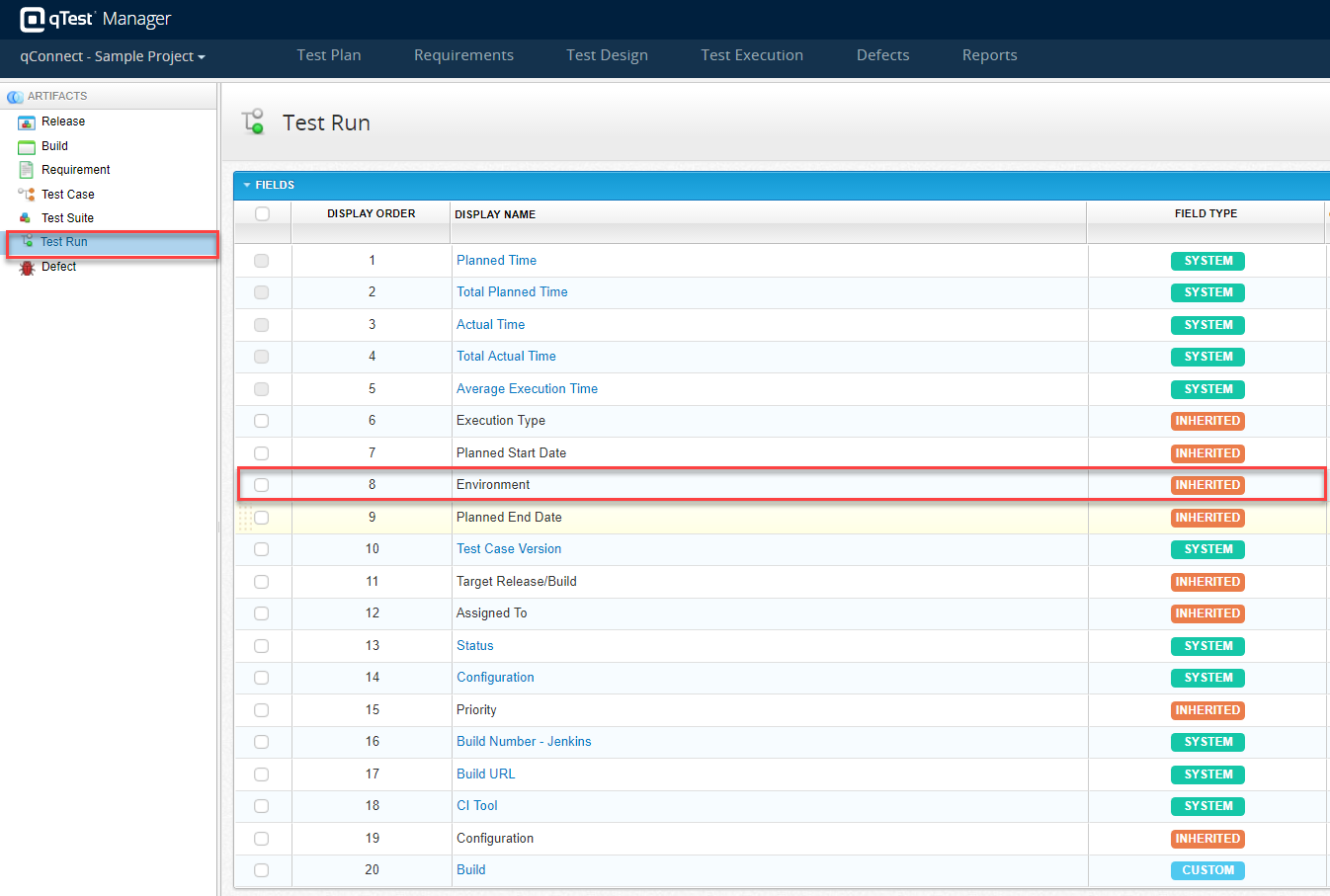 In the following example, when we select the Test Run artifact from the left panel. The Environment field is inherited: