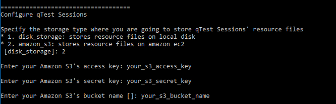 If you want to store resource files on Amazon S3 enter "2" or "amazon_s3" and input S3 access key, S3 secret key and bucket name:
