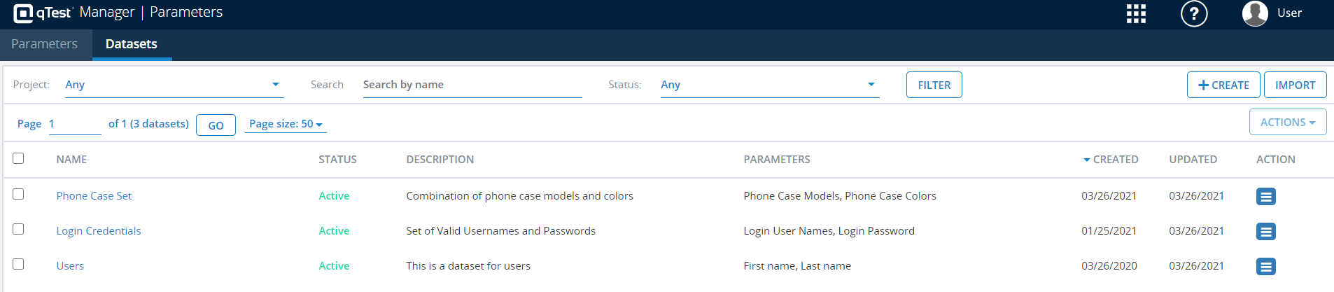 Filter Description Project Click the Project filter to search for and select qTest projects. If a Project is selected, only Datasets associated with that Project will display on the Datasets tab. Search Enter a Dataset name to search for that specific Dataset. Status Select Active to display only active Datasets. Select Inactive to display only inactive Datasets. Select All to display both active and inactive Datasets.