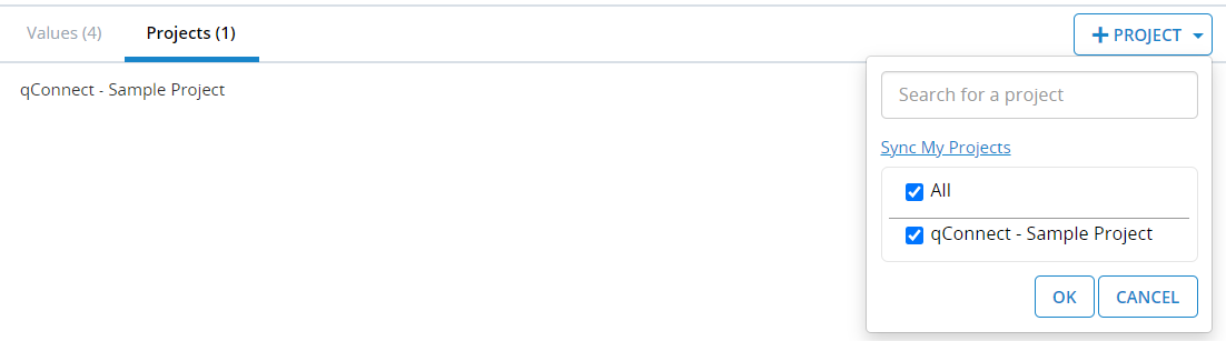 By default, the Parameter will be associated with all of your qTest Projects. To change the Project associated with the Parameter, click the Projects tab. Then click the Project button, which will display a list where you can select the Projects that the Parameter should be associated with. Click OK to save your selections.