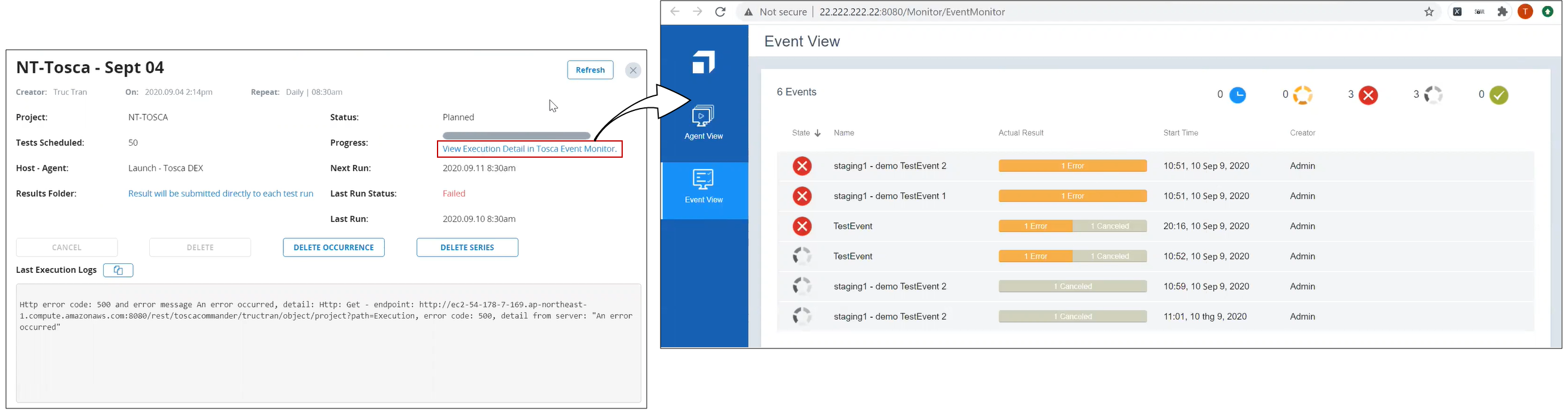 A new link has been added to the Job Details dialog, allowing you to easily access Tosca Event Monitor, where you can monitor test executions for scheduled Tosca tests. The new View Execution Detail in Tosca Event Monitor link displays beneath the progress bar on the Job Details dialog. Click the link to open Tosca Event Monitor in a separate browser tab.