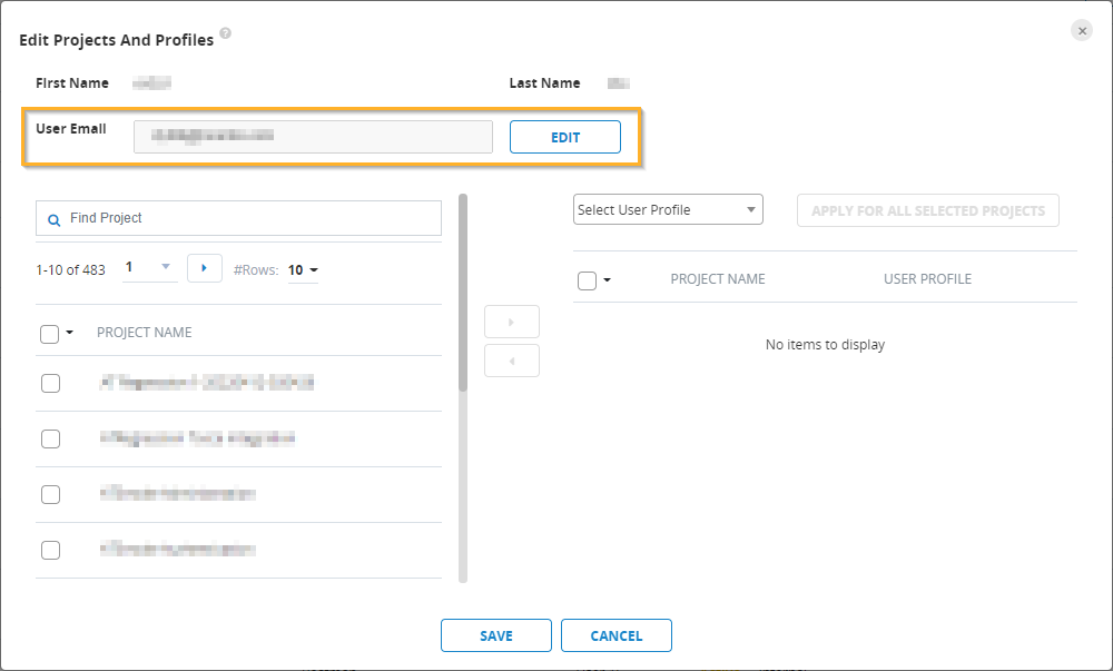 Users who have rights to modify profile data can now change email addresses of local and users. To do so, navigate to the Administration area, choose a profile, and select the action Edit Projects and Profiles.