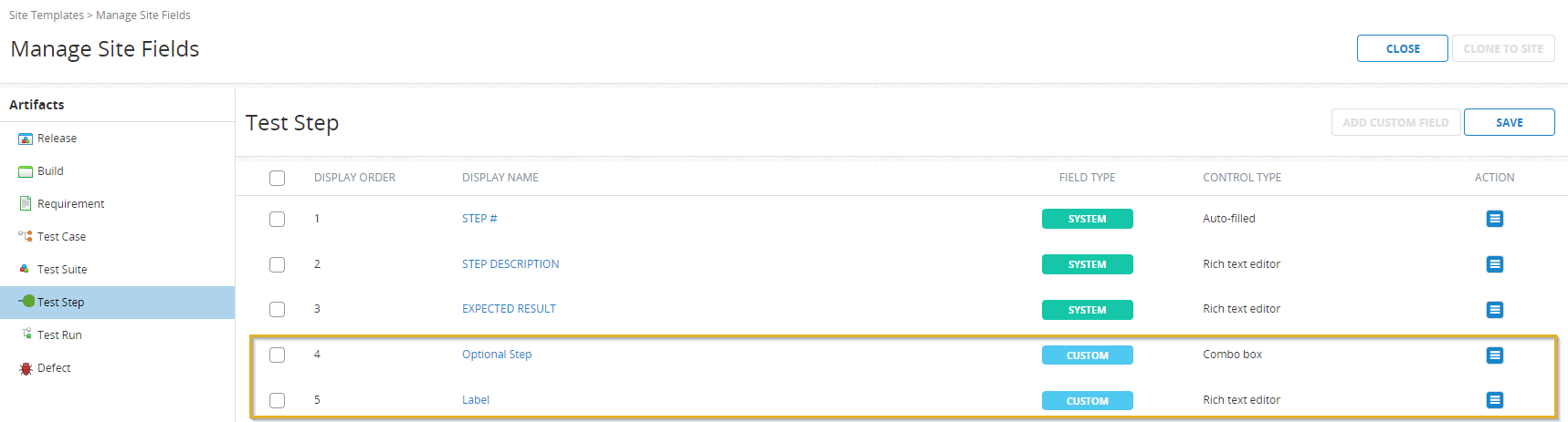 To add custom test step columns, navigate to Site Fields in Administration and select Manage Site Fields. From here, you can add and customize the new columns under Test Step.
