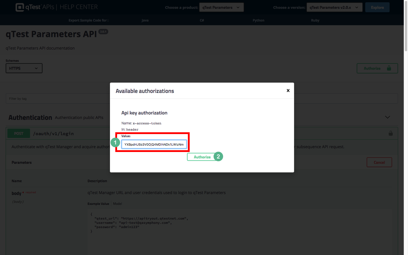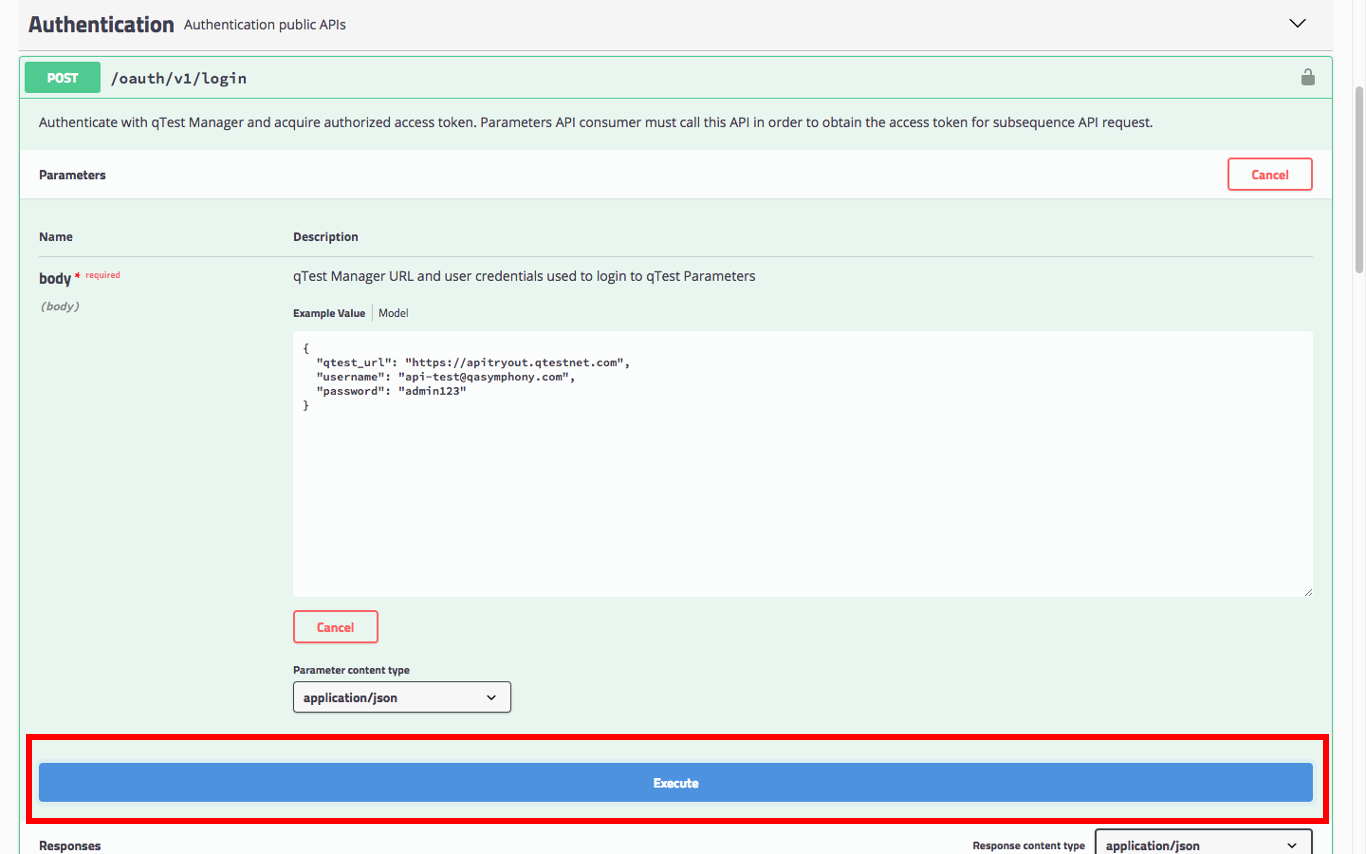 API endpoint: https://parameters.qTestnet.com/oauth/v1/login