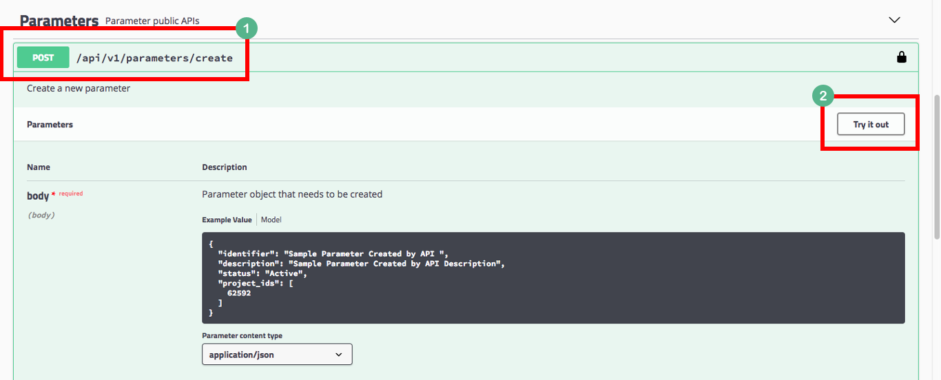 Expand the api/v1/parameters/create section. Then click the Try it out button.