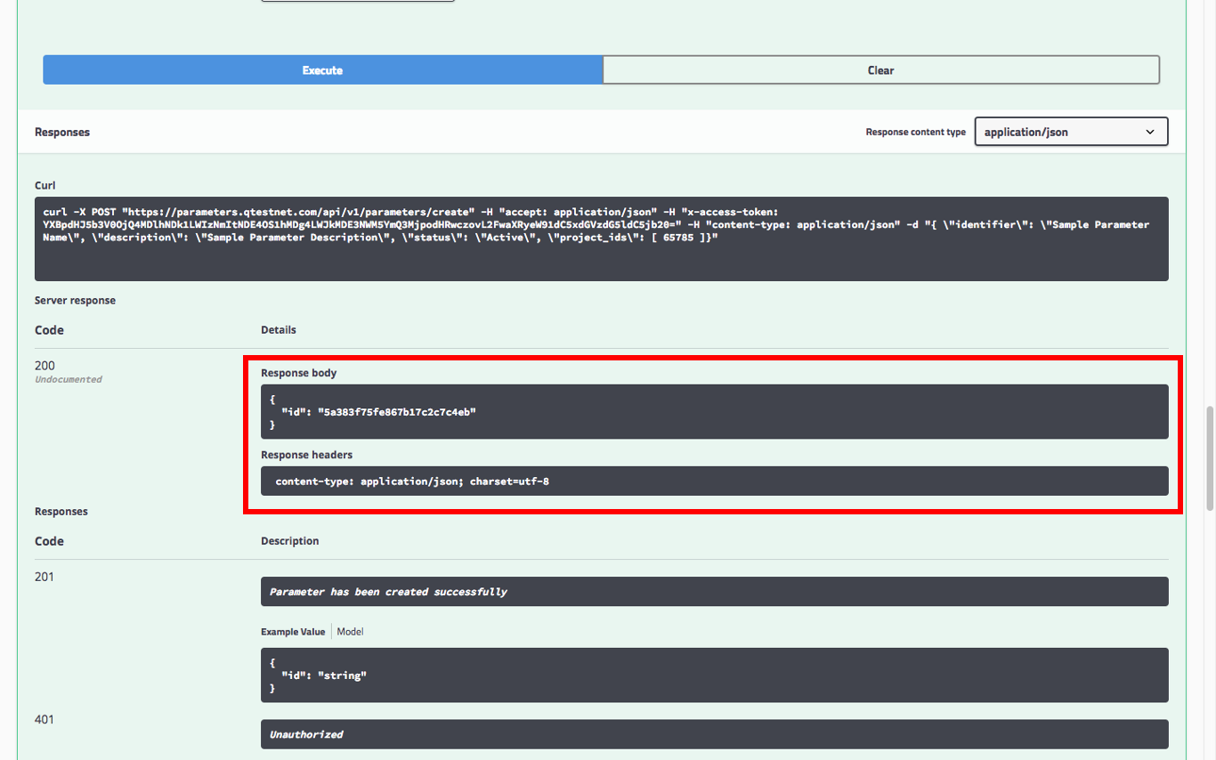 The Create Parameter API will be executed, and you will see a successful response that looks like the following screenshot.