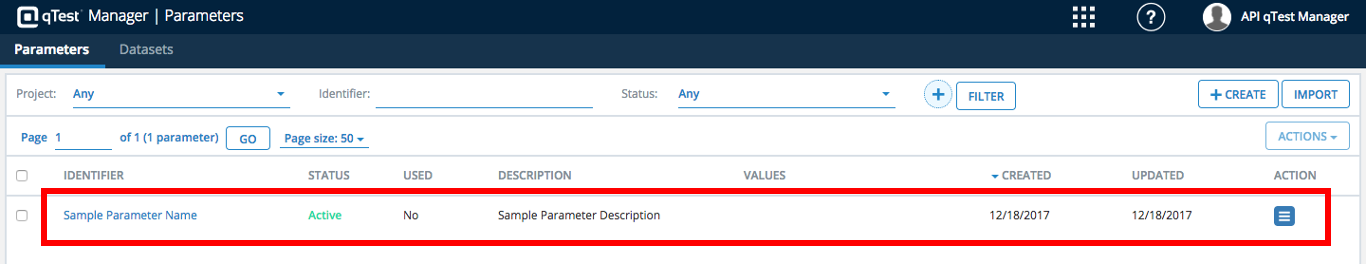 { "identifier": "[Name of the new parameter]", "description": "[Description of the new parameter]", "status": "[Status of the new parameter: Active | Inactive | Archived]", "project_ids": [an array of qTest Manager project ids that the new parameter will be associated with, separated by a comma] }The API documentation provides an ID of a sample project in qTest Manager, naming qConnect - Sample Project that you can use to try out the API. Also note that this sample project ID changes over time.