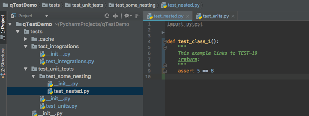 Here is the directory structure of our example project. There is no application, but this is a common test structure you would see. In the Editor window, we see an example usage of Jira tickets in the doc strings. As you can see this test will generate a failure.