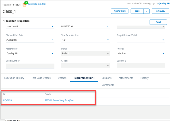 The Jira User Story (qTest Requirements) is now linked to the Test Case: