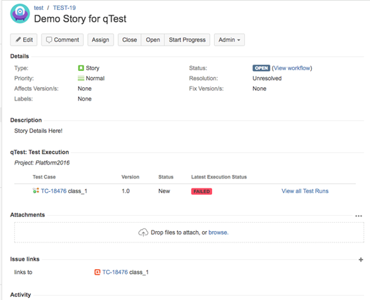 We also have the qTest Jira plug-in enabled. Here you can see that the Jira icket is updated automatically through qTest integration with Test Runs results. In this example, we see that a User Story in Jira displays the failed Test Run status.