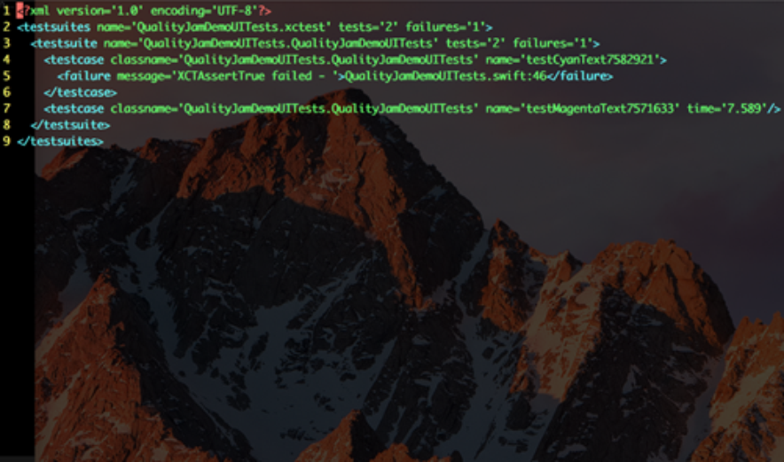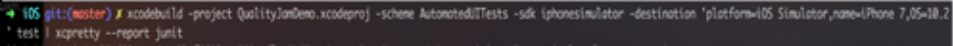 xcode Build -project QualityJamDemo.xcodeproj -scheme AutomatedUITests -sdk iphonesimulator -destination 'platform=iOS Simulator,name=iPhone 7,OS=10.2' test | xcpretty --report junit