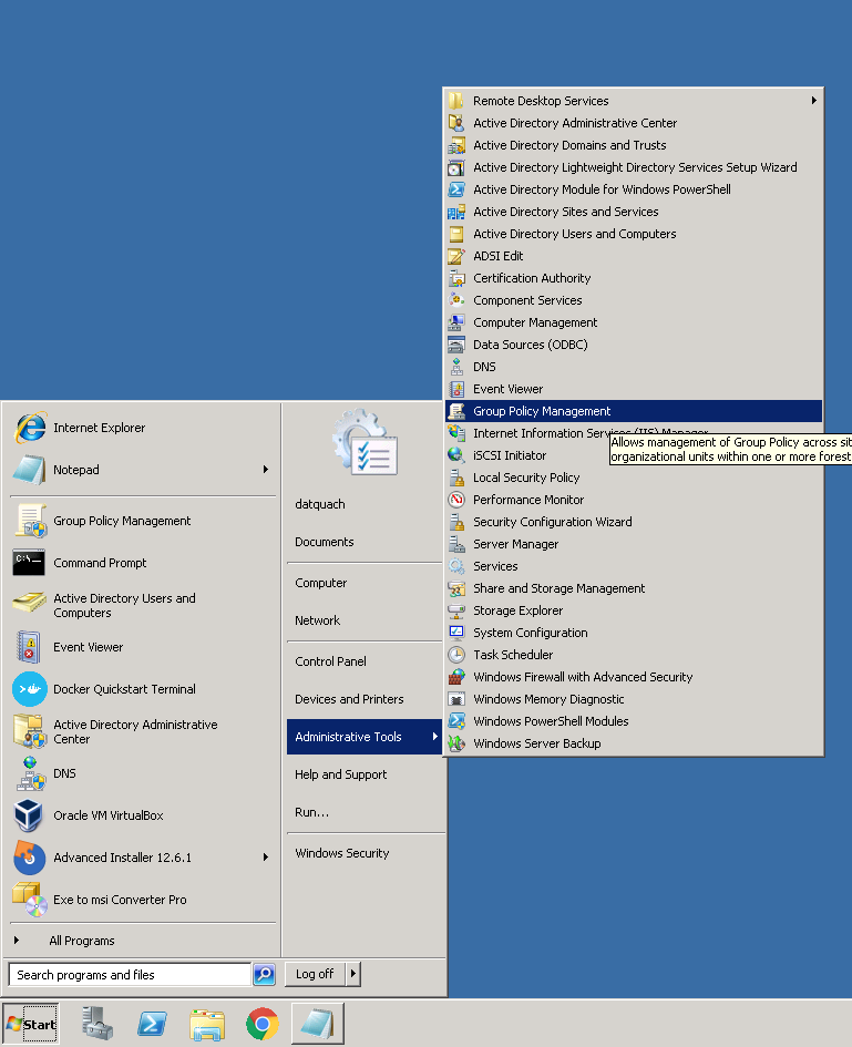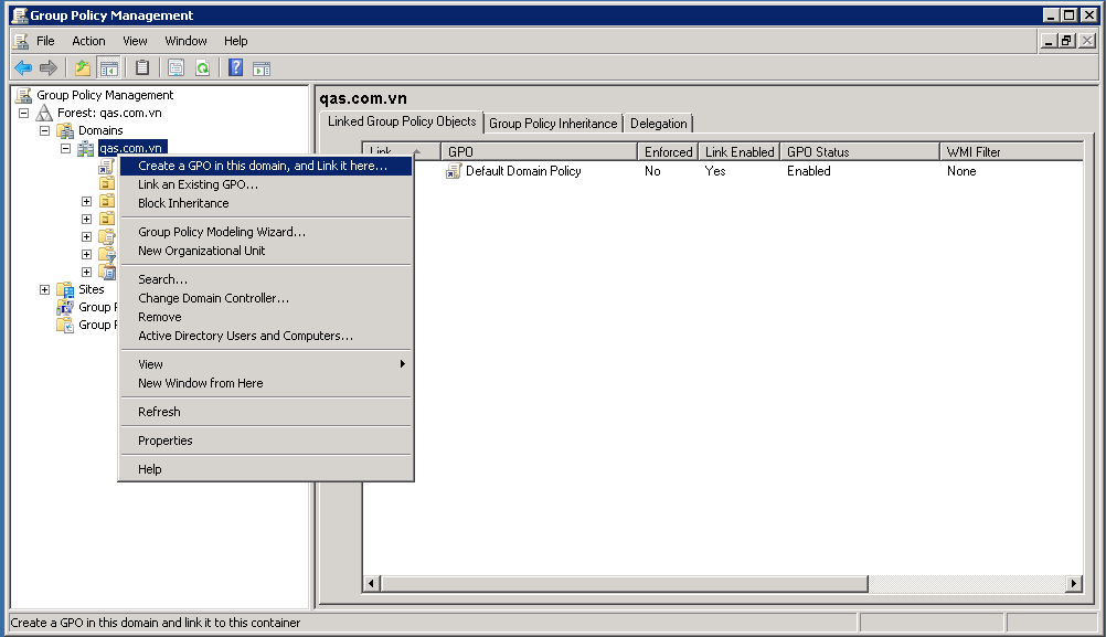 From the Group Policy Management console, navigate to your domain. Then right-click the domain name and select Create a GPO in this domain and Link it here from the pop-up menu.