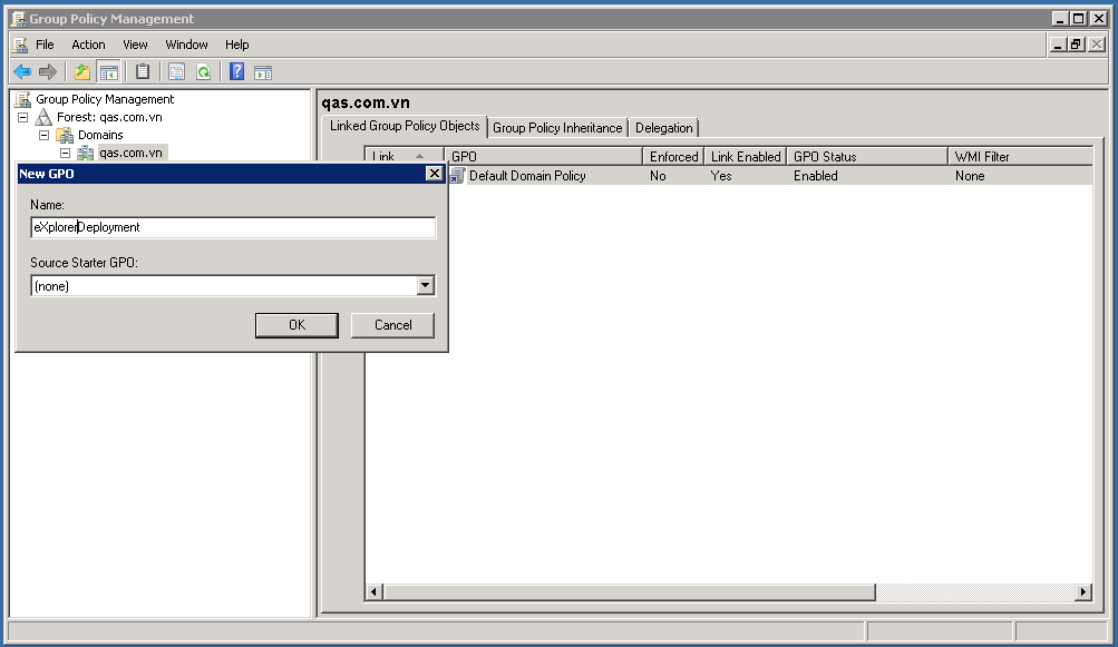 The New GPO dialog is now displayed. Enter ExplorerDeployment into the Name text box. Then click OK. This Group Policy Object will be created under the selected domain.
