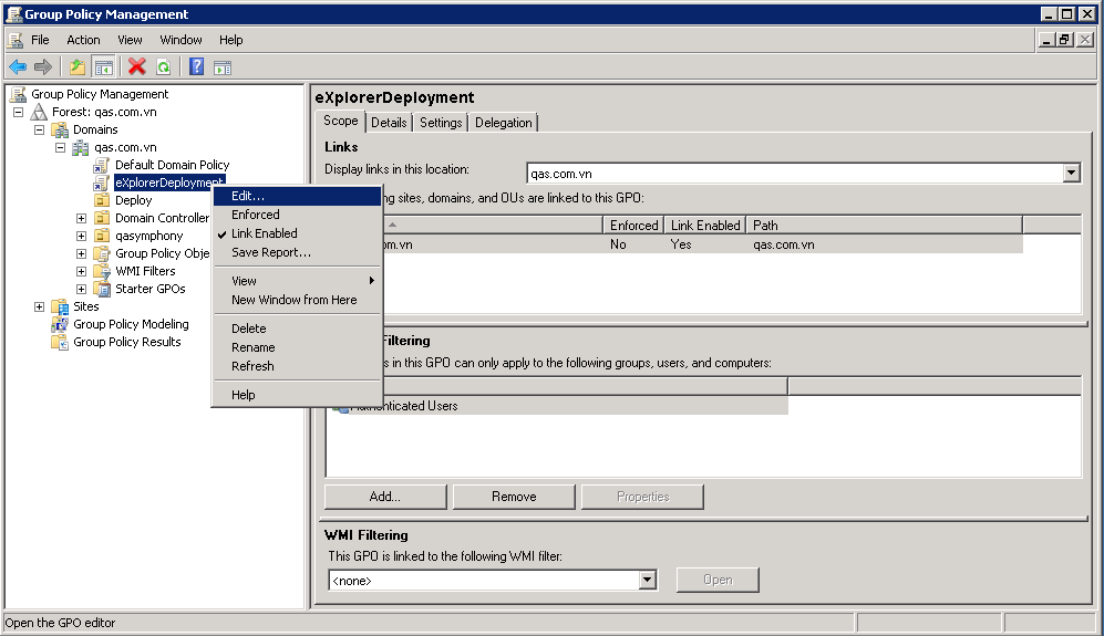 Right-click the new Group Policy Object named ExplorerDeployment. Then select Edit from the context menu.