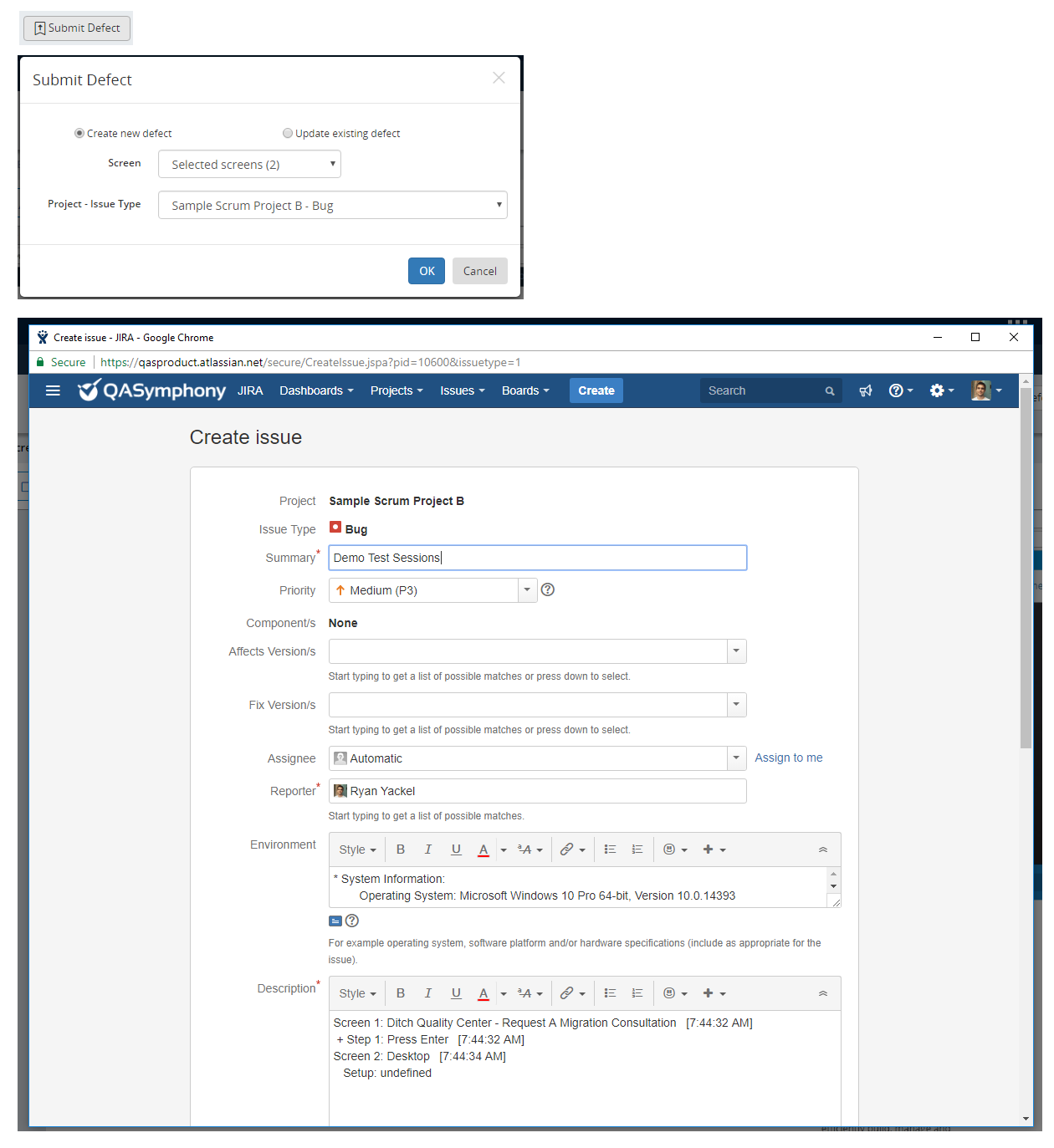 You will be presented with Submit defect dialog. Depending on your configured defect tracker, your Submit defect dialog might be different from the below screenshot which creates a new defect to Jira defect tracker.